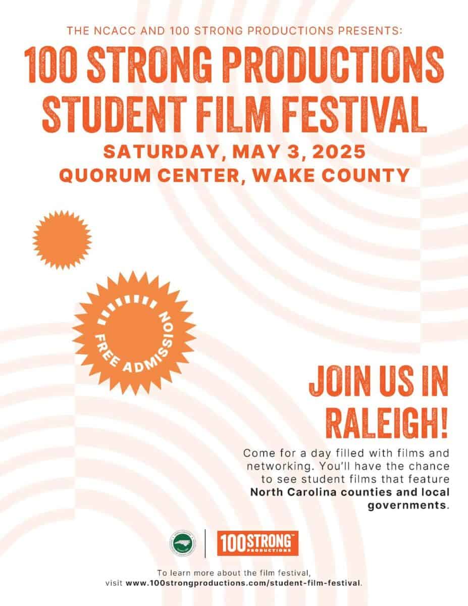NCACC’s 100 Strong Productions is presenting the inaugural Student Film Festival on Saturday, May 3, 2025, from 1 to 5 p.m., at The Quorum Center, 323 W Jones Street, Raleigh, North Carolina.