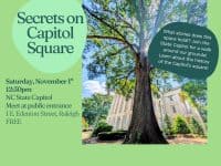 Join Capitol staff for a free tour of Capitol Square, 1 E Edenton Street, Raleigh, North Carolina on November 1, 2025, at 12:30 p.m. On this guided walk you'll learn about the history of the 6-acre property the state Capitol calls home. The grounds have stood silent witness to more than 230 years of both city and state history, despite often being overshadowed by the Capitol building. It … [Read more...] about Secrets on Capitol Square: Free guided walk Nov. 1
