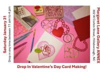 Margaret Lane Gallery Annex/F-Stop 2, at 302 W Corbin Street, Hillsborough, North Carolina, is hosting a Drop-In Valentine's Day Card Making event on Saturday, January 31, 2026, from 11 a.m. to 4 p.m. Drop in any time. There will be lots of cardmaking supplies, everything you need to make Valentine’s Day cards for all your loved ones. This event was announced on Facebook. All skill levels … [Read more...] about Drop-in Valentine’s Day Card Making at Margaret Lane Gallery Annex/F-Stop 2