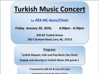 American-Turkish Association NC is presenting a free concert on Friday, January 30, 2026, from 6 to 8:30 p.m., at ATA-NC Turkish House, 303 E Durham Road, Cary, North Carolina. The program includes: This concert is presented by ATA-NC and Cary Art Loop, and sponsored in part by the Town of Cary Parks Recreation and Cultural Resources Department. Free concert. Donations are welcome and … [Read more...] about Free Turkish Music Concert in Cary on Jan. 30