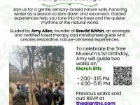 The Plant, at 220 Lorax Lane, Pittsboro, North Carolina, is hosting a Daylight Saving Nature Walk on Sunday, March 8, 2026. In honor of the Tree Museum’s one-year Birthday, enjoy a Daylight Saving Nature Walk with Amy Allen.This gentle, sensory-based walk invites you to slow down, connect with the trees, and tend to yourself during this changing of time. Guided experiences will help you drop … [Read more...] about Daylight Saving Nature Walk at the Plant in Pittsboro March 8