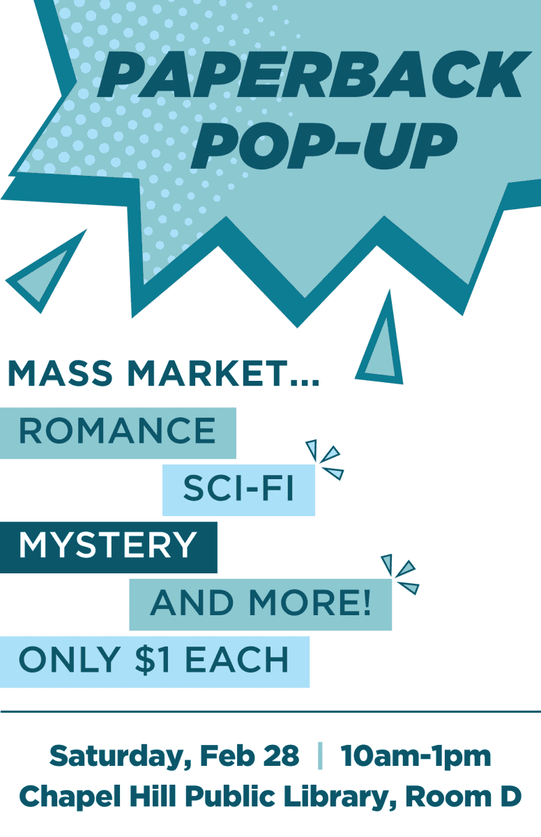 Friends of Chapel Hill Public Library is holding a Paperback Pop-Up Sale on Saturday, February 28, 2026, from 10 a.m. to 1 p.m., at Chapel Hill Public Library, 100 Library Drive Chapel Hill, North Carolina.