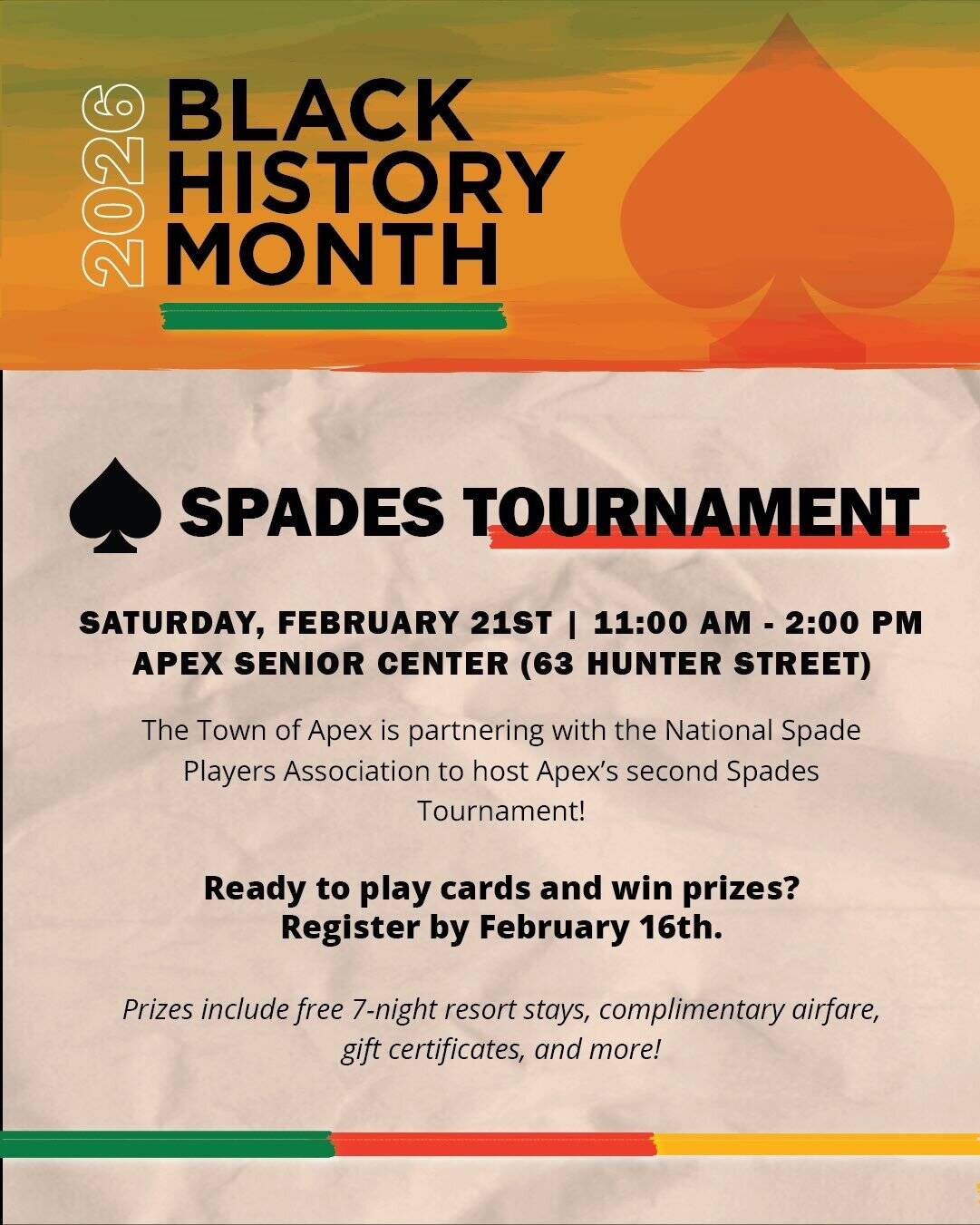 The Town of Apex is presenting Apex! Spades Tournament on Saturday, February 21, 2026, from 11 a.m. to 2 p.m., at Apex Senior Center, 63 Hunter Street, Apex, North Carolina.