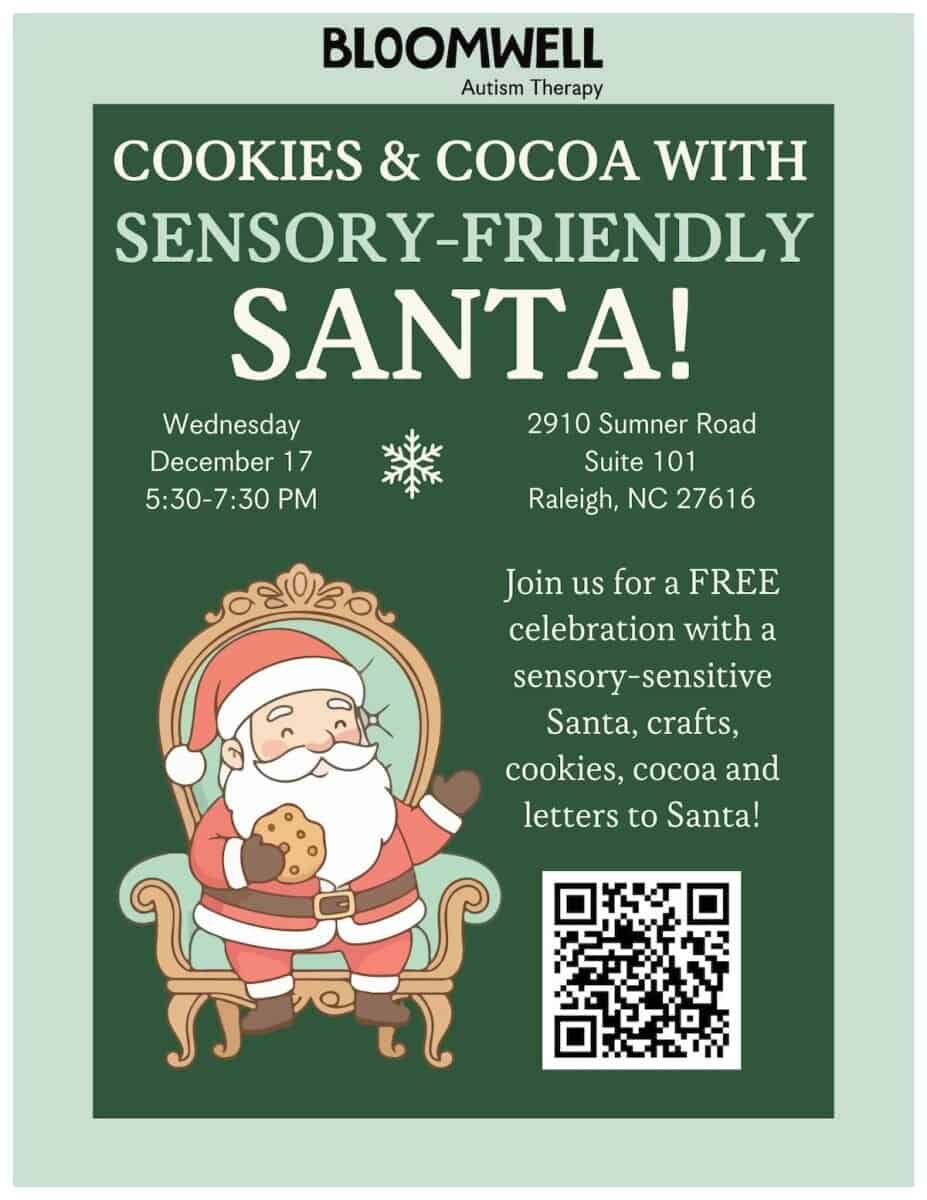 Bloomwell Autism Therapy, 2910 Sumner Road, Suite 101, Raleigh, North Carolina, is hosting Cookies & Cocoa with Sensory-Friendly Santa on Wednesday, December 17, 2025, from 5:30 to 7:30 p.m.