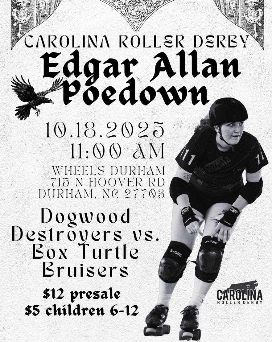 Skaters from the Carolina Roller Derby home teams, the Dogwood Destroyers and the Box Turtle Bruisers, will compete in the Edgar Allan Poedown on Saturday, October 18, 2025, from 11 a.m. to 1 p.m.