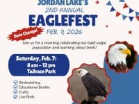 Jordan Lake, at 2060 Jordan Dam Road, Moncure, North Carolina, is celebrating its population of Bald Eagles with its second annual EagleFest. It's been rescheduled to February 7, 2026, due to the winter weather on January 24 and January 31. Follow the Jordan Lake website and Jordan Lake Facebook page for more announcements. Jordan Lake is home to at least 25 nesting pairs of bald eagles. In the … [Read more...] about EagleFest at Jordan Lake rescheduled to Feb. 7
