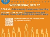 Enjoy a Chanukah party at Steel String Brewery, 106A S Greensboro Street, Carrboro, North Carolina, on Wednesday, December 17, 2025, from 6:30 to 8:30 p.m. This event is presented by Kehilla Synagogue. Please register here. If you RSVP you'll get free drinks and Chanukah treats! Schedule: … [Read more...] about Chanukah Party at Steel String Brewery in Carrboro Dec. 17