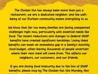 The Chicken Hut, at 3019 Fayetteville Street, Durham, North Carolina, has announced on social media that it's giving away 400 FREE packaged meals to people facing food insecurity due to the loss of SNAP benefits on Monday, November 10, 2025, from 11:30 a.m. to 2 p.m. Please come by and show your SNAP card to receive one free boxed lunch. While supplies last! … [Read more...] about Chicken Hut giving away 400 pre-packaged meals to those facing food insecurity Nov. 10