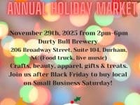 Handcrafted DURM Market takes place several times throughout the year at Durty Bull Brewing Company, 206 Broadway Street, Suite 104, Durham, North Carolina. Shop for fresh and funky crafts of all sorts, jewelry and accessories and more. These events are free to attend. Handcrafted DURM Schedule Handcrafted DURM Holiday MarketSaturday, November 29, 20252 to 6 p.m.Free Celebrate … [Read more...] about Handcrafted DURM Holiday Market Nov. 29