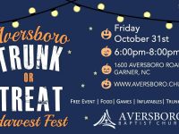 Aversboro Road Baptist Church, at 1600 Aversboro Road, Garner, NC, is hosting Trunk or Treat Harvest Fest on Friday, October 31st, 2025, from 6 to 8 p.m. This is a free event. The parking lot will be full of decorated trunks, carnival-style games, inflatables, free concessions, live entertainment, and more. Costumes are welcome for kids of all ages! Enjoy a night of fun, including … [Read more...] about Aversboro Trunk or Treat Harvest Fest Oct. 31