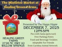 Shop for holiday gifts at the Mistletoe Market at Healing Green Farms, 2728 NC Hwy 42, Willow Springs, North Carolina, on Sunday, December 7, 2025, from 12 to 5 p.m. This is a free event presented by The Happy Hippie. Parking is free. At this event: … [Read more...] about The Mistletoe Market at Healing Green Farms Dec. 7
