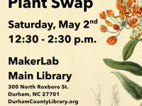 Durham County Library is hosting a Spring Plant Swap on Saturday, May 2, 2026, from 12:30 to 2:30 p.m., in the MakerLab at the Main Library, 300 N Roxboro Street, Durham, North Carolina. Registration helps the library with planning. Bring your saplings, shrubs, bulbs, houseplant cuttings, flowers, and seeds to swap and share! Check out the Digging Durham Seed Library resources and seeds! … [Read more...] about Spring Plant Swap at Durham Main Library May 2