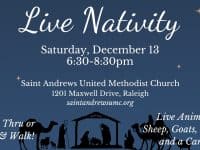 Saint Andrews United Methodist Church, at 1201 Maxwell Drive, Raleigh, North Carolina, is hosting a Live Nativity event on Saturday, December 13, 2025, from 6:30 to 8:30 p.m. It's free to attend. You can drive through or park and walk. There will be live animals, including sheep, goats, a donkey and a camel. … [Read more...] about Live Nativity at Saint Andrews United Methodist Church in Raleigh Dec. 13