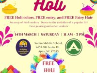Holi is a popular Hindu festival. It's also known as the "Festival of Love," "The Festival of Colors," and "The Festival of Spring." The most well-known aspect of Holi is a free-for-all throwing of colored powder at participants. The Town of Apex and Hum Sub are hosting the Apex Holi Festival on Saturday, March 14, 2026, from 11 a.m. to 3 p.m., at Salem Middle School, 6150 Old Jenks Road, Apex, … [Read more...] about Apex Holi Festival March 14
