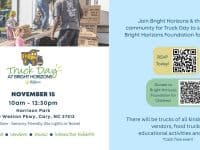 Bright Horizons, at 800 Weston Parkway, Cary, North Carolina, is hosting Truck Day on Saturday, November 15, 2025, from 10 a.m. to 12:30 p.m. Admission is free. The event features trucks of all kinds, as well as food trucks, vendors, music, interactive exhibits, and more. 10 a.m. to 10:45 a.m. will be sensory friendly, with no lights or noise. … [Read more...] about Truck Day at Bright Horizons in Cary on Nov. 15