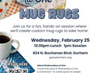 Grace Lutheran Church, 824 N Buchanan Blvd, Durham, North Carolina, is hosting their Wednesday at One program on Wednesday, February 25, 2026, from 12:30 to 2 p.m. Enjoy lunch at 12:30 p.m., and then, at 1 p.m., the LWML Quilters will lead a session on making Mug Rugs, a fun, simple, and customizable sewing project that you’ll be able to take home and enjoy. It's all FREE to attend. Please … [Read more...] about Wednesdays at One at Grace Lutheran Church: Free Lunch and Mug Rug Crafting Feb. 25