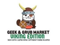 Geek and Grub Market is a celebration of all things geek! Play giant games, eat great food, and purchase geeky items from an array of local geek-themed artisans. This themed monthly market, which is presented by the folks at Triangle Game Night, is free to attend. Each market features 30+ geeky vendors, giant games, food trucks, and fun competitions. The events are free to attend. Geek … [Read more...] about Geek & Grub Market: Viking Edition Nov. 15