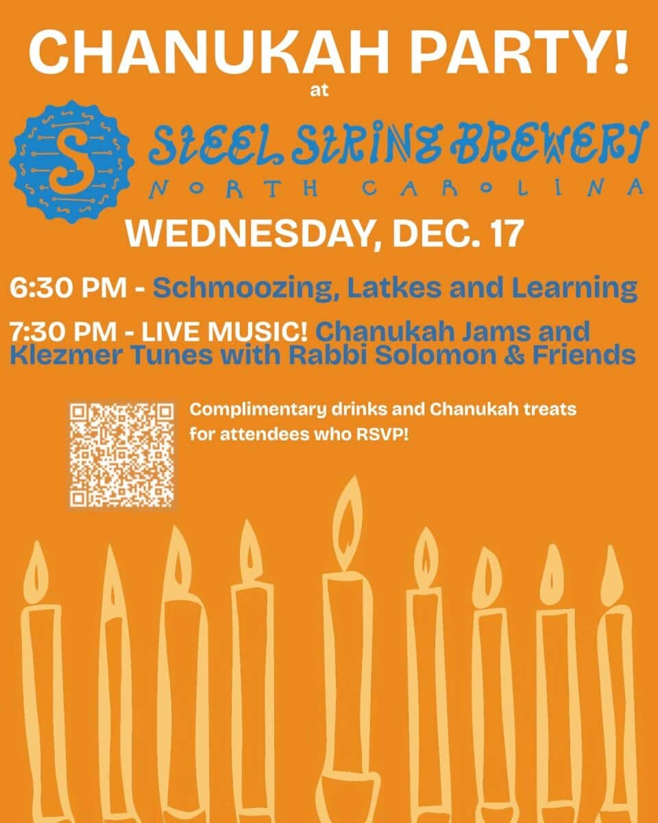 Enjoy a Chanukah party at Steel String Brewery, 106A S Greensboro Street, Carrboro, North Carolina, on Wednesday, December 17, 2025, from 6:30 to 8:30 p.m.