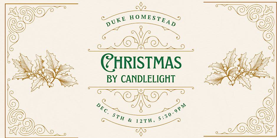 Duke Homestead State Historic Site, 2828 Duke Homestead Road, Durham, North Carolina, is hosting Christmas by Candlelight on Friday, December 5, and Friday, December 12, 2025, from 5:30 to 9 p.m.
