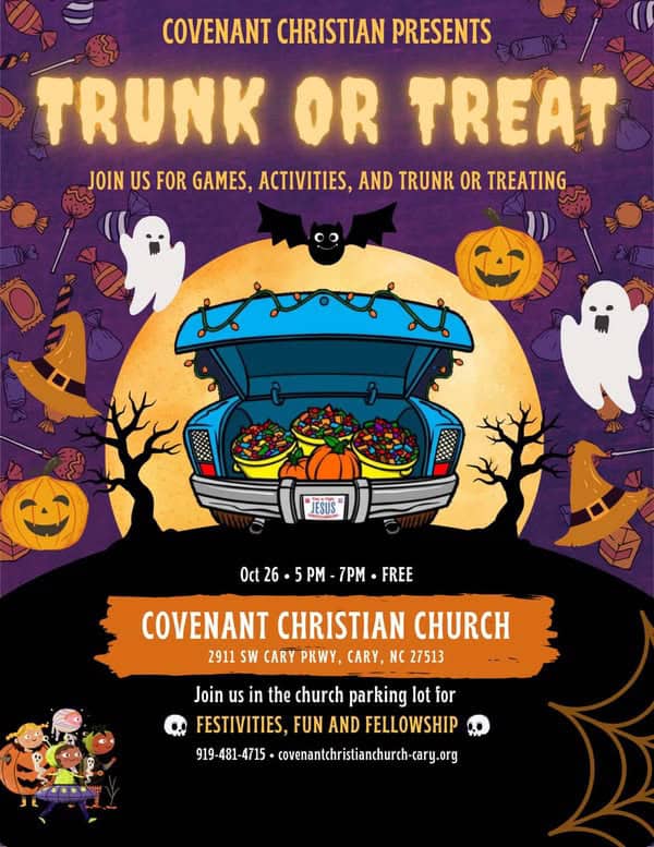 Covent Christian Church, 2911 SW Cary Parkway, Cary, is hosting a Trunk or Treat on Sunday, October 26, 2025, from 5 to 7 p.m.
