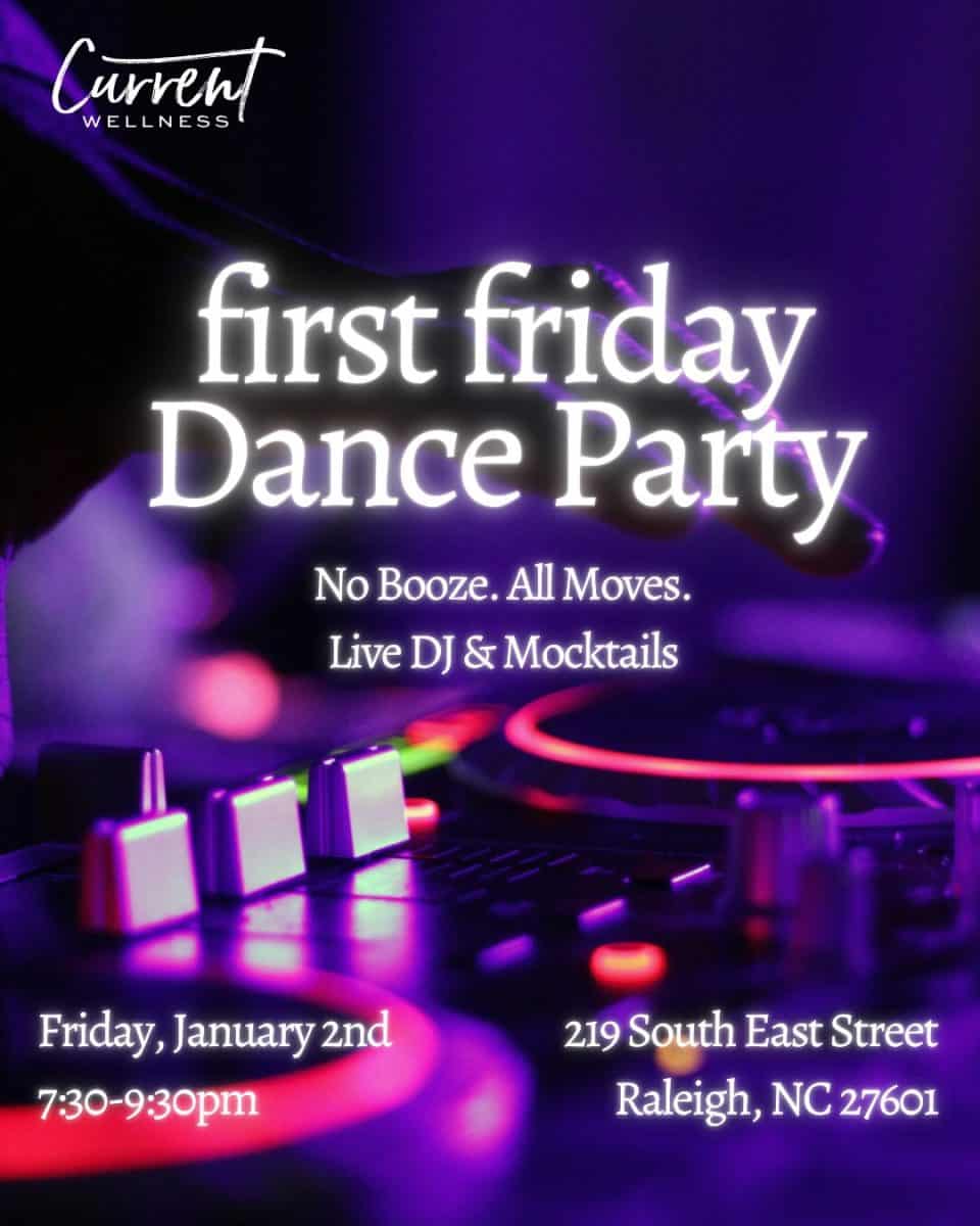 Current Wellness, at 219 S East Street, Raleigh, NC, is hosting a First Friday Dance Party on Friday, January 2, 2026, from 7:30 to 9 p.m. The cover charge is $10.