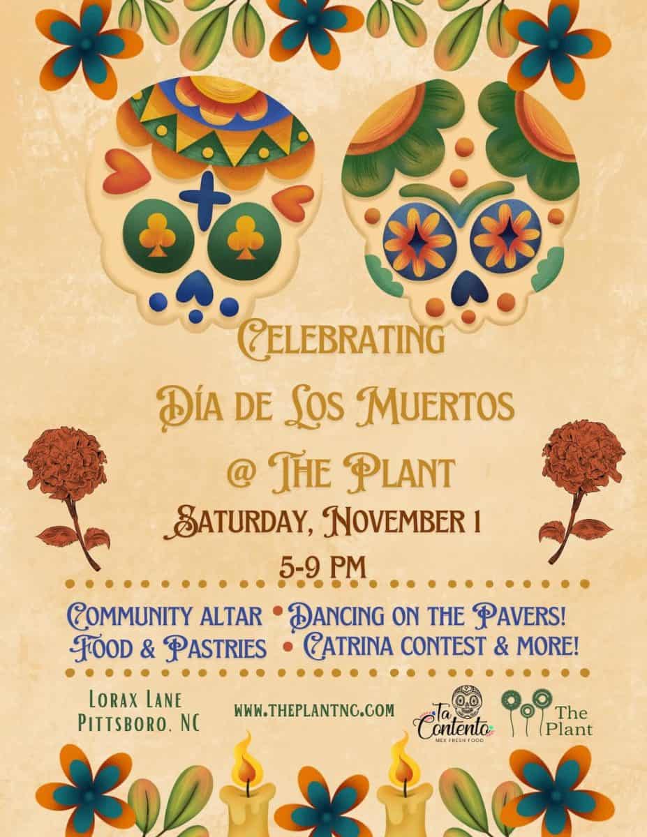 The Plant, 220 Lorax Lane, Pittsboro, North Carolina is hosting a Dia de los Muertos celebration on Saturday, November 1, 2025, from 5 to 9 p.m.