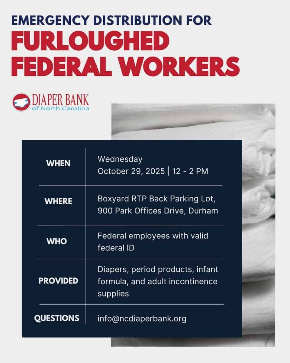 Diaper Bank of North Carolina is hosting an emergency distribution for furloughed federal workers on Wednesday, October 29, 2025, from 12 to 2 p.m., at Boxyard RTP, 900 Park Offices Drive, Durham, North Carolina.