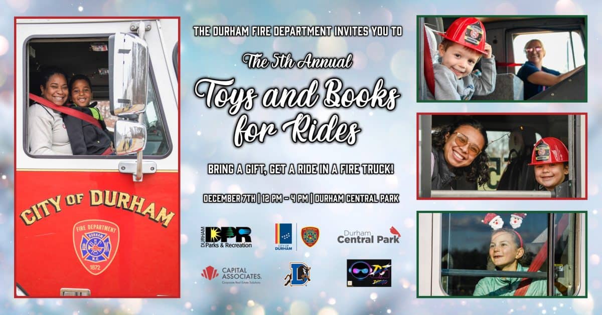 The Durham Fire Department is hosting the 5th Annual Toys and Books for Rides on Sunday, December 7, 2025, from 12 to 4 p.m., at Durham Central Park, 501 Foster Street, Durham, North Carolina.