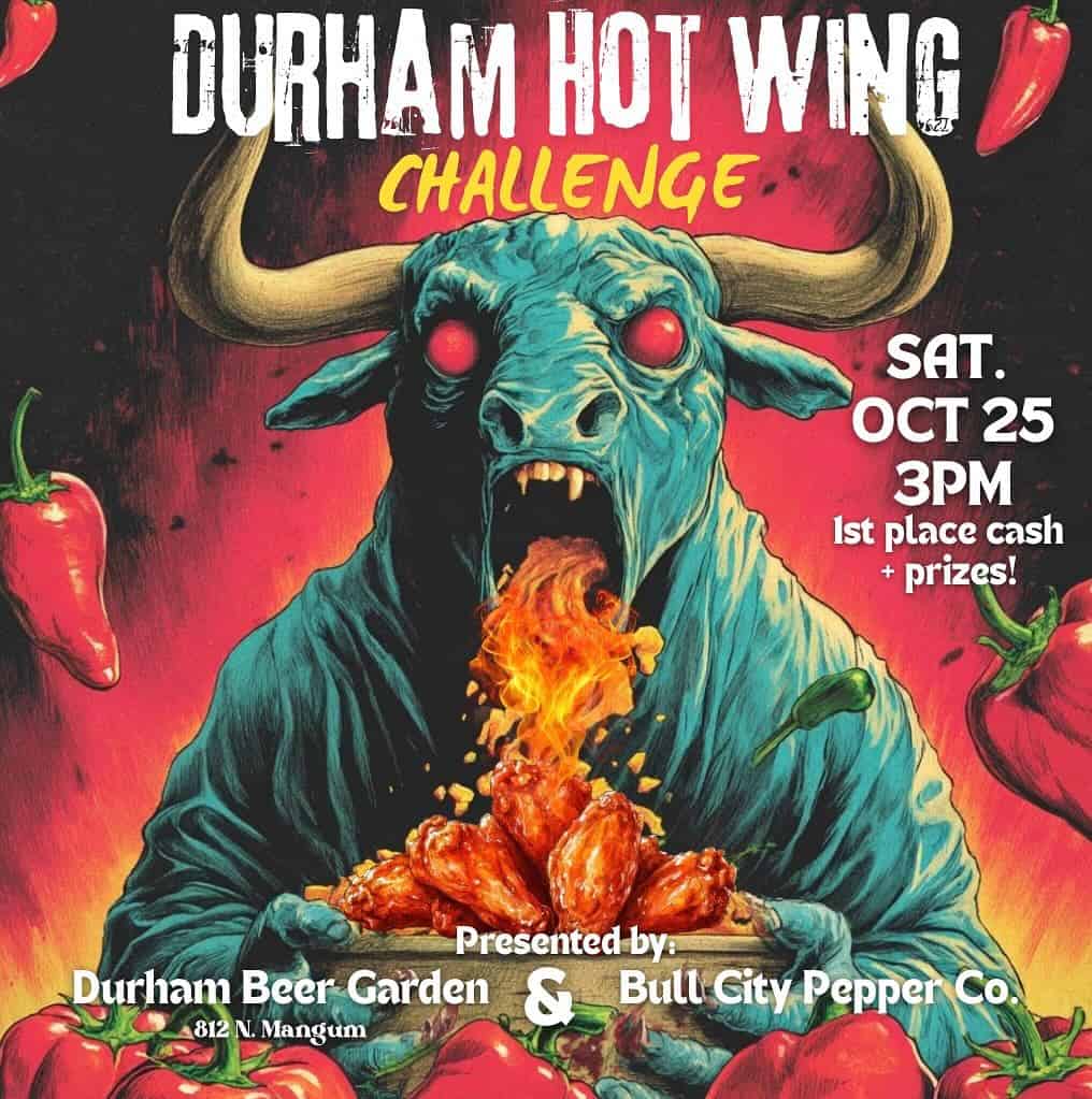 Durham Beer Garden and Bull City Pepper Co. are presenting the Durham Hot Wing Challenge on Saturday, October 25, 2025, at 3 p.m. It takes place at Durham Beer Garden, 812 N. Mangum Street, Durham, North Carolina.
