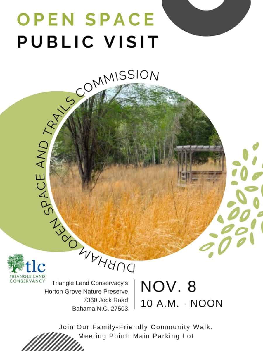 Join the Durham Open Space and Trails Commission (DOST) for a family-friendly community walk at the beautiful and historical Horton Grove Nature Preserve, 7360 Jock Road, Bahama, North Carolina, on Saturday, November 8, 2205, from 10 a.m. to 12 p.m.
