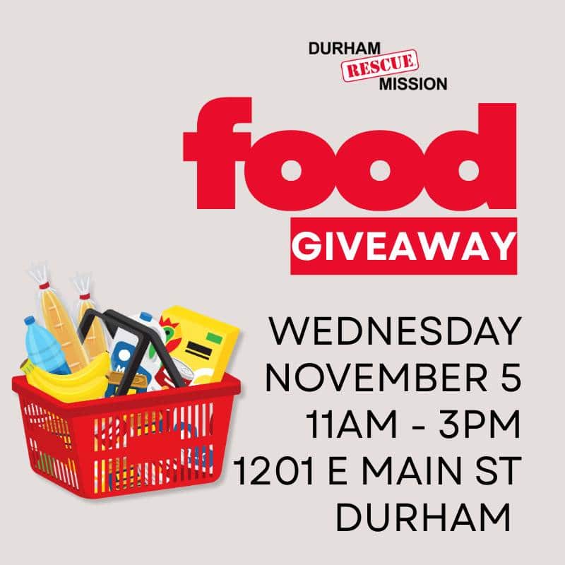 Durham Rescue Mission, 1201 E Main Street, Durham, North Carolina, is holding a drive-thru and walk-thru food giveaway on Wednesday, November 5, 2025, from 11 a.m. to 3 p.m., or while supplies last.