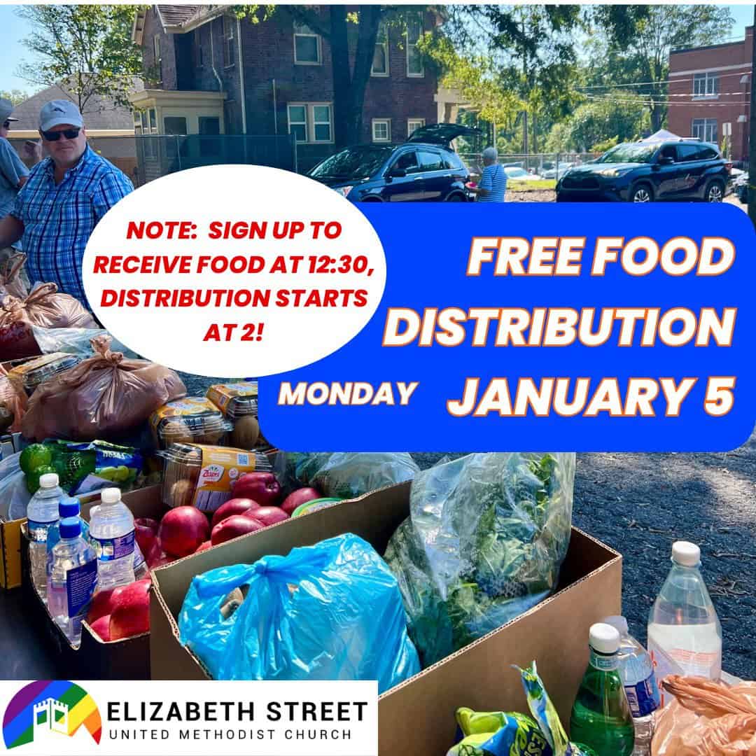 Elizabeth Street UMC usually hosts free food distributions the first Monday of the month at 2 p.m. If it’s a holiday, the event will be moved to the following Monday. If it’s raining the event might also be rescheduled.