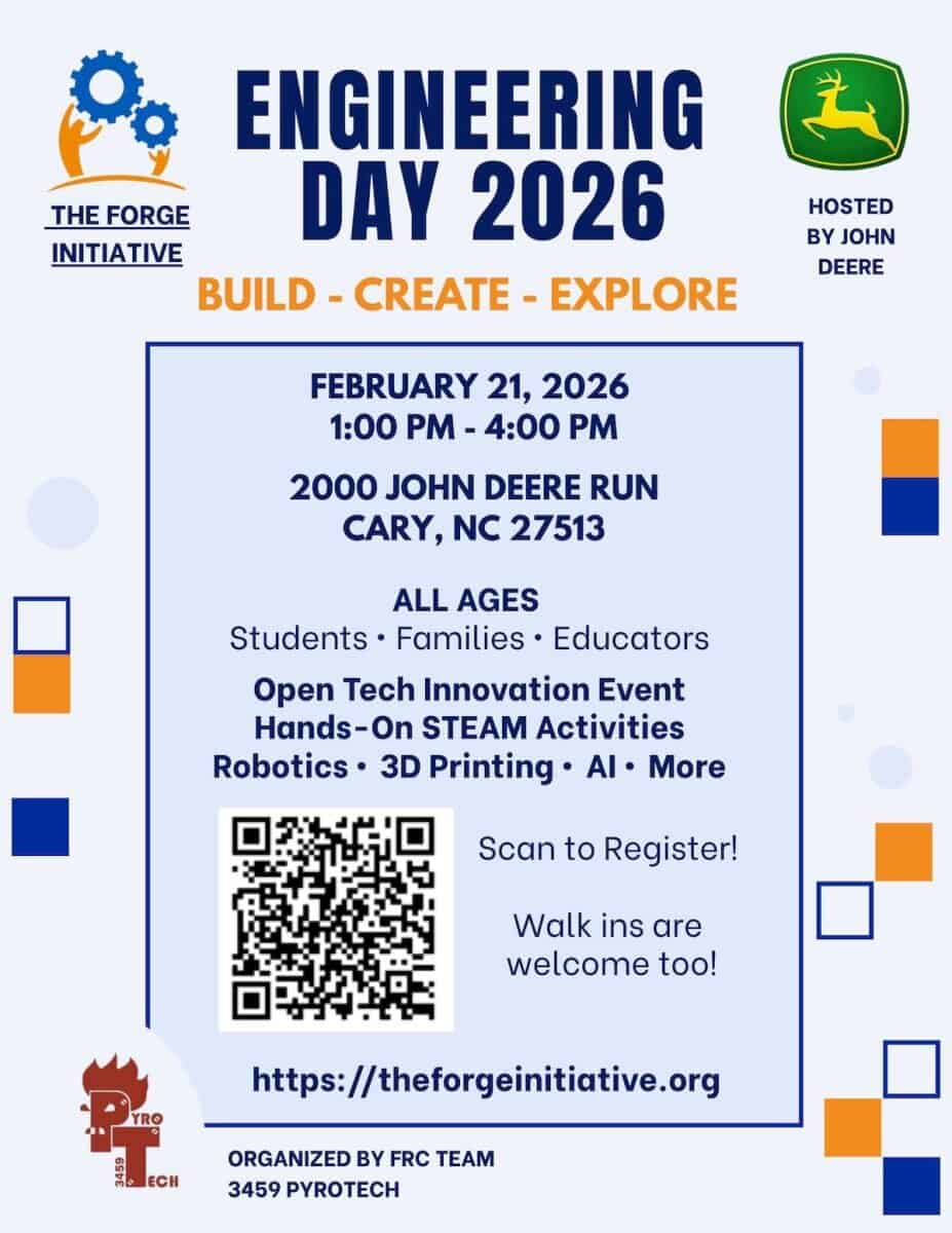 The Forge Initiative is holding its 9th Engineering Day on February 21, 2026, from 1 to 4 p.m., at John Deere, 2000 John Deere Run, Cary, North Carolina.