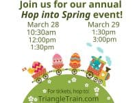 New Hope Valley Railway, 3900 Bonsai Road, New Hill, is offering its annual Hop Into Spring rides on March 28 and 29, 2026. This is a chance to celebrate all things spring, with a train ride behind the historic locomotive. New Hope Valley Railway is known at Triangle's Train. Ride the train, meet the Easter Bunny and take part in a colorful visual egg hunt, which is an "I Spy" game during the … [Read more...] about New Hope Valley Railway’s Hop Into Spring Train Rides March 28 and 29