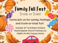 Rawls Baptist Church, 10665 US-401, Fuquay-Varina, North Carolina, is hosting Family Fall Fest Trunk or Treat on Friday, October 31, 2025, from 6 to 9 p.m. It takes place in the church parking lot. Enjoy a safe environment for trunk or treat, with costumes, candy, decorations and free hot dogs. … [Read more...] about Family Fall Fest and Trunk or Treat at Rawls Baptist Church in Fuquay-Varina