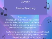 Binkley Baptist Church, 1712 Willow Drive, Chapel Hill, North Carolina, is hosting a free concert on Sunday, April 26, 2026, at 7 p.m. The Chancel Choir, accompanied by Mike Harris, and assisted by friends, both singers and instrumentalists, will present an evening of Classical Music gems that have stood the test of time, from the Baroque period to the Modern era. A reception will follow … [Read more...] about Free classical music concert at Binkley Baptist Church Apr. 26
