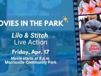 Morrisville Parks, Recreation & Cultural Resources is hosting Movie in the Park on Friday, April 17, 2026, at Morrisville Community Park, 1520 Morrisville Parkway, Morrisville, NC. The movie is Lio & Stitch Live Action. This is a free event. The movie will begin at 8 p.m., but it's recommended that you arrive early to grab a great spot. Bring a chair or blanket. There will be free … [Read more...] about Movie in the Park in Morrisville: Lilo & Stitch Live Action Apr. 17