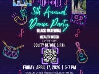 Equity Before Birth is hosting its 5th annual Dance Party in honor of Black Maternal Health Week on Friday, April 17, 2026, from 5 to 7 p.m., at Museum of Life and Science, 433 West Murray Avenue, Durham, North Carolina. The event is free, but registration is required. This family-friendly community celebration is a time for laughter, fun, dancing (optional, but encouraged!) and being in … [Read more...] about Equity Before Birth’s 5th Annual Dance Party Apr. 17