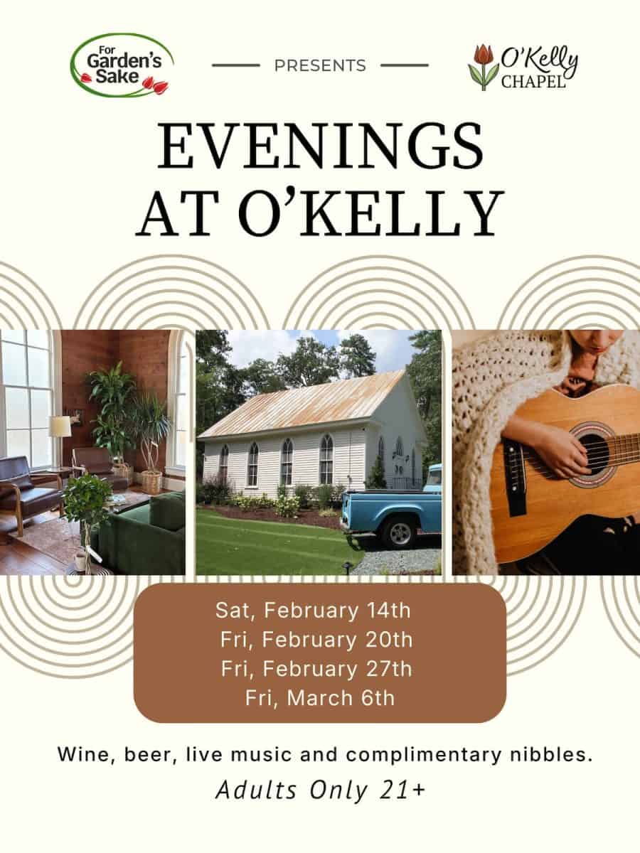 Evenings at O’Kelly is a free live music series that take place at O’Kelly Chapel at For Garden’s Sake, 9245 NC-751, Durham, North Carolina.