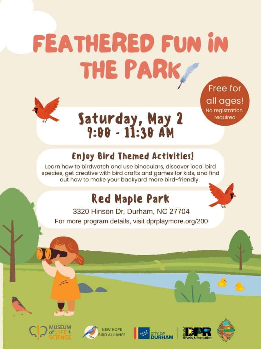 Durham Parks & Recreation is hosting Feathered Fun in the Park on Saturday, May 2, 2026, from 9 to 11:30 a.m., at Red Maple Park, 3320 Hinson Drive, Durham, North Carolina.