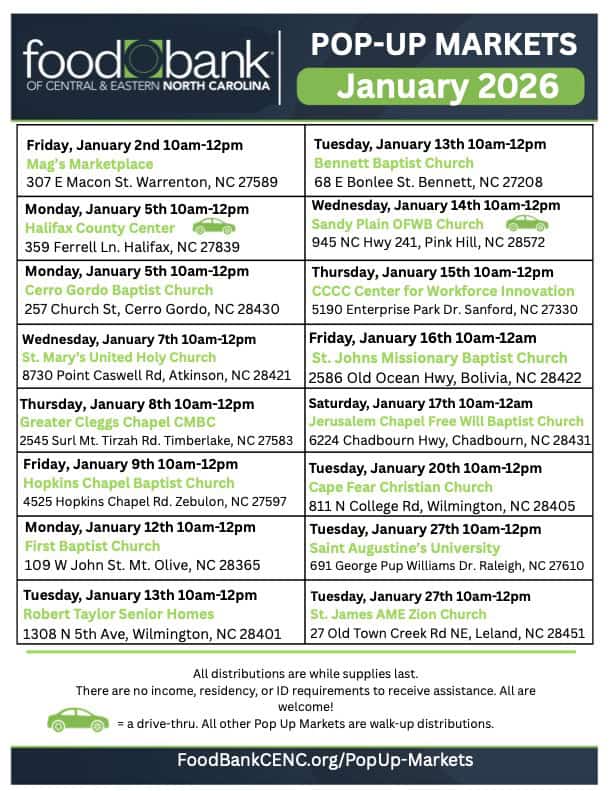 Food Bank of Central & Eastern North Carolina offers many free giveaways at pop-up events throughout the month. The goal of these pop-up events is to supplement the work of locally run food pantries, soup kitchens and other organizations that distribute food to those in need.