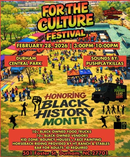 The Throwdown Events and Entertainment is presenting For the Culture Food Truck Festival on Saturday, February 28, 2026, from 3 to 10 p.m., at Durham Central Park, 501 Foster Street, Durham, North Carolina.