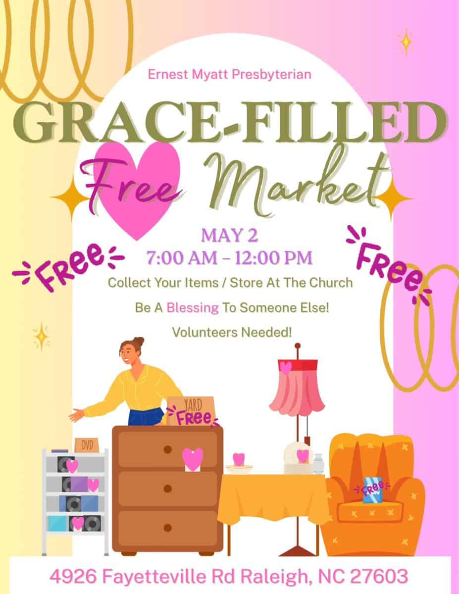 Ernest Myatt Presbyterian Church, 4926 Fayetteville Road, Raleigh, North Carolina, is holding a Grace Filled Free Market on May 2, 2026, from 7 a.m. to 12 p.m.