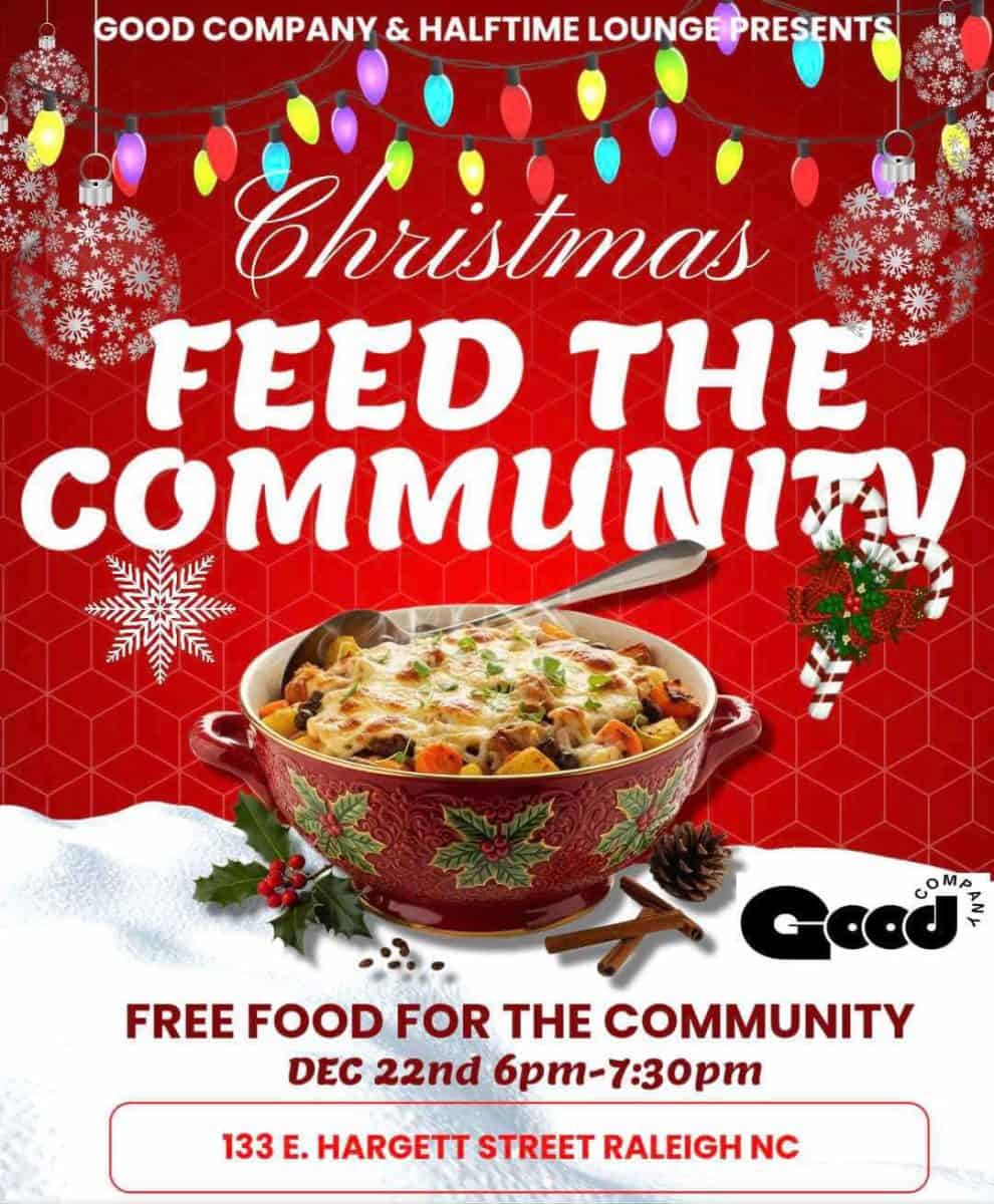 Halftime Lounge, at 133 E Hargett Street, Raleigh, North Carolina, announced on Instagram that it’s hosting a free dinner for the community on Monday, December 22, 2025, from 6 to 7:30 p.m.