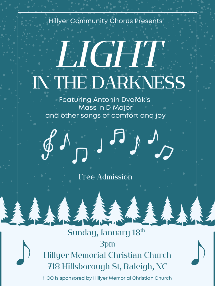 Hillyer Community Chorus will present a free concert, Light in the Darkness, on Sunday, January 18, 2026, at 3 p.m., at Hillyer Memorial Christian Church, 718 Hillsborough Street, Raleigh, North Carolina.