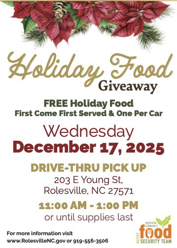 Town of Rolesville, North Carolina, is holding a Holiday Food Giveaway on Wednesday, December 17, 2025, from 11 a.m. to 1 p.m., or while supplies last, at 203 E Young Street, Rolesville, North Carolina.