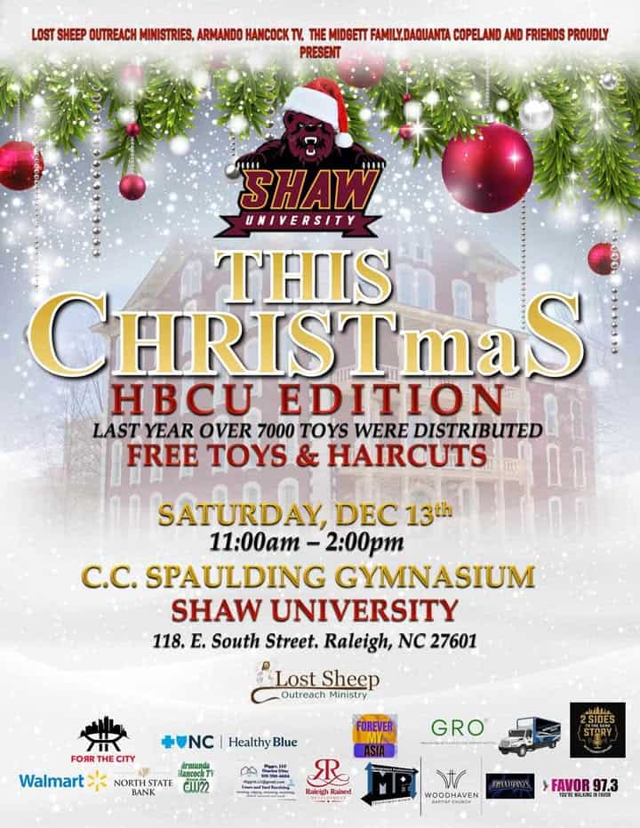 Lost Sheep Outreach Ministry is presenting THIS CHRISTmaS: HBCU Edition on Saturday, December 13, 2025, from 11 a.m. to 2 p.m., at C.C. Spaulding Gymnasium, Shaw University, 118 E. South Street, Raleigh, North Carolina.