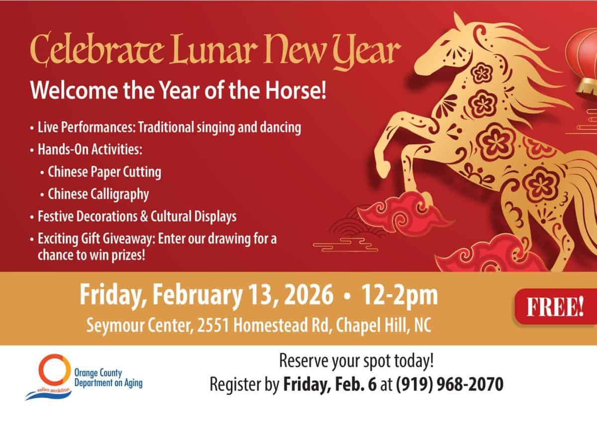 Orange County Department on Aging is hosting a Lunar New Year celebration at Seymour Center, 2551 Homestead Road, Chapel Hill, North Carolina, on Friday, February 13, 2026, from 12 to 2 p.m.