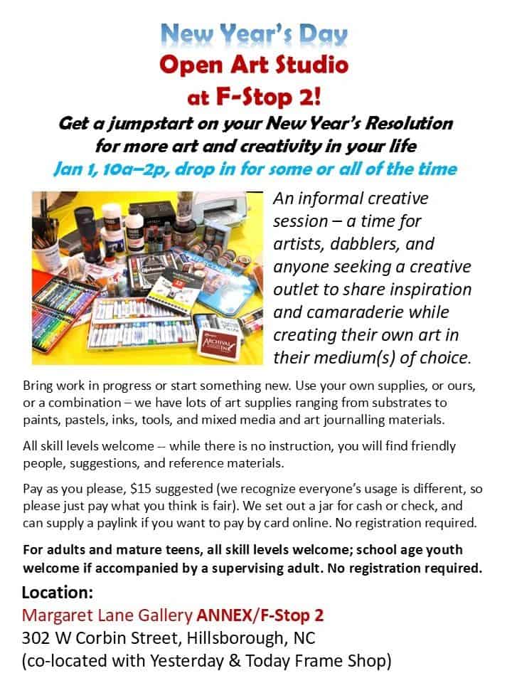 Start the year off with some creative flair! Join Margaret Lane Gallery at an Open Studio Event at Margaret Lane Gallery Annex/F-Stop 2, at 302 W Corbin Street, Hillsborough, North Carolina, which is co-located with Yesterday & Today Frame Shop.