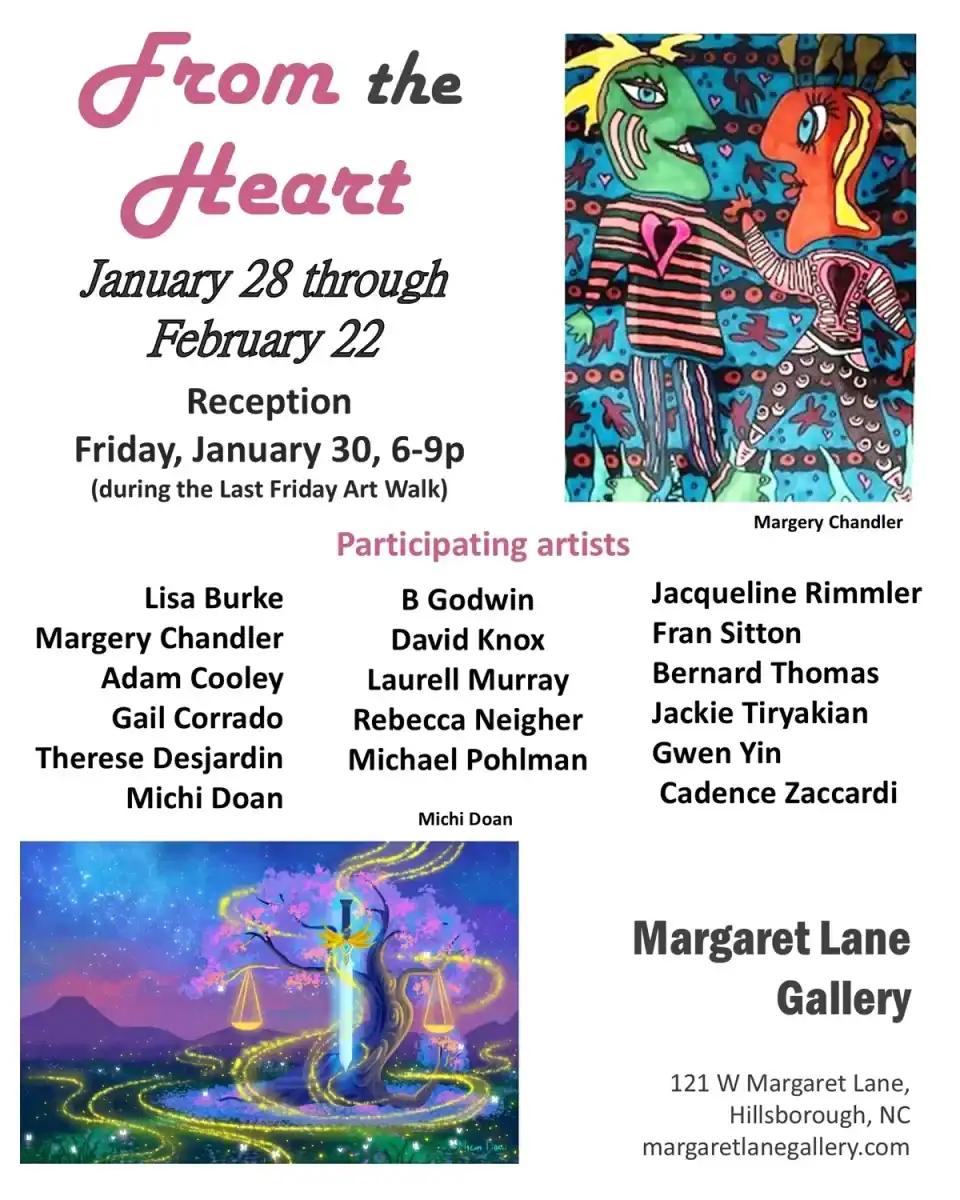 Margaret Lane Gallery, 121 West Margaret Lane, Hillsborough, North Carolina, features work from 35+ local artists, monthly curated show and rotating exhibits. The art gallery also hosts events and workshops. Learn about upcoming events on their website and Facebook page.